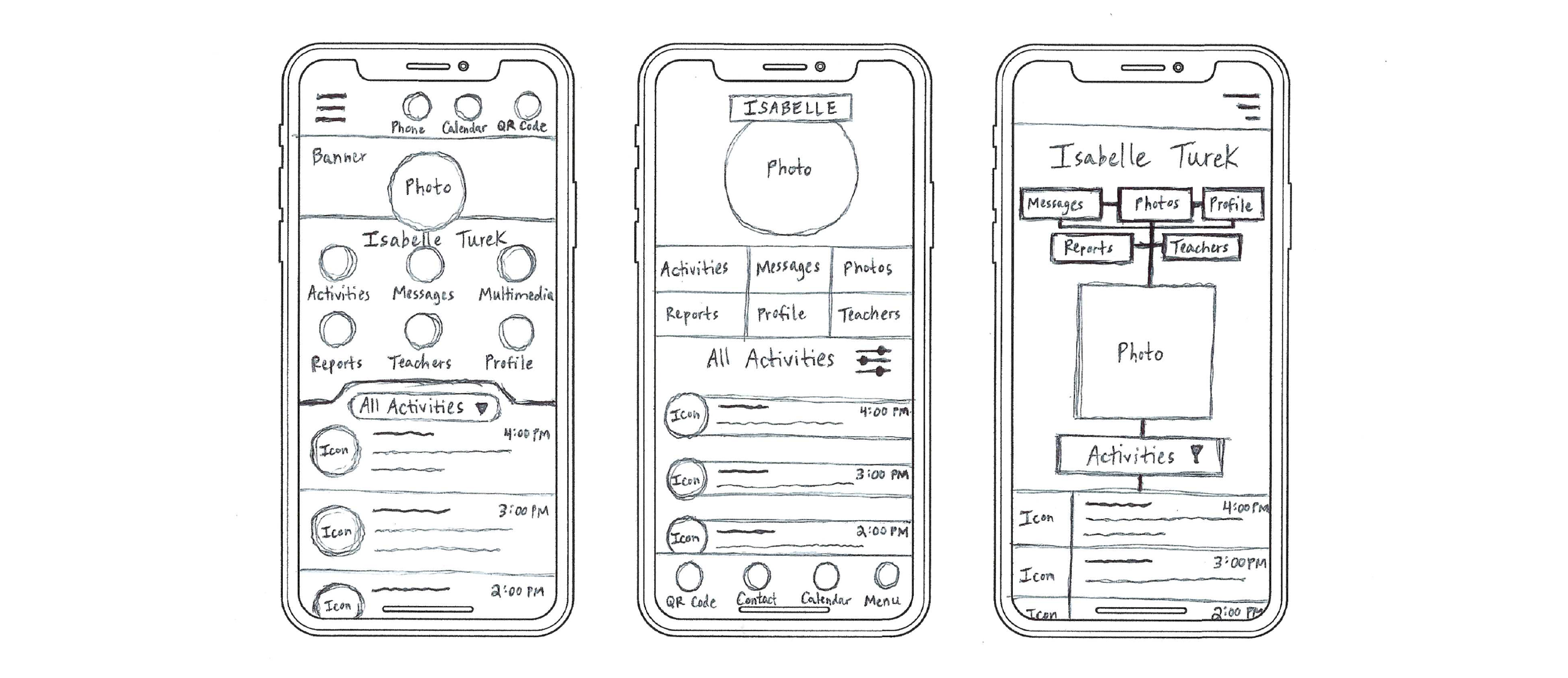I created user flows, design sketches, and wireframes prior to prototyping. My sketches were rudimentary and primarily explored how to design an effective homepage, as that particular screen was the most complex and was where parents spent the bulk of their time while using the Procare app.