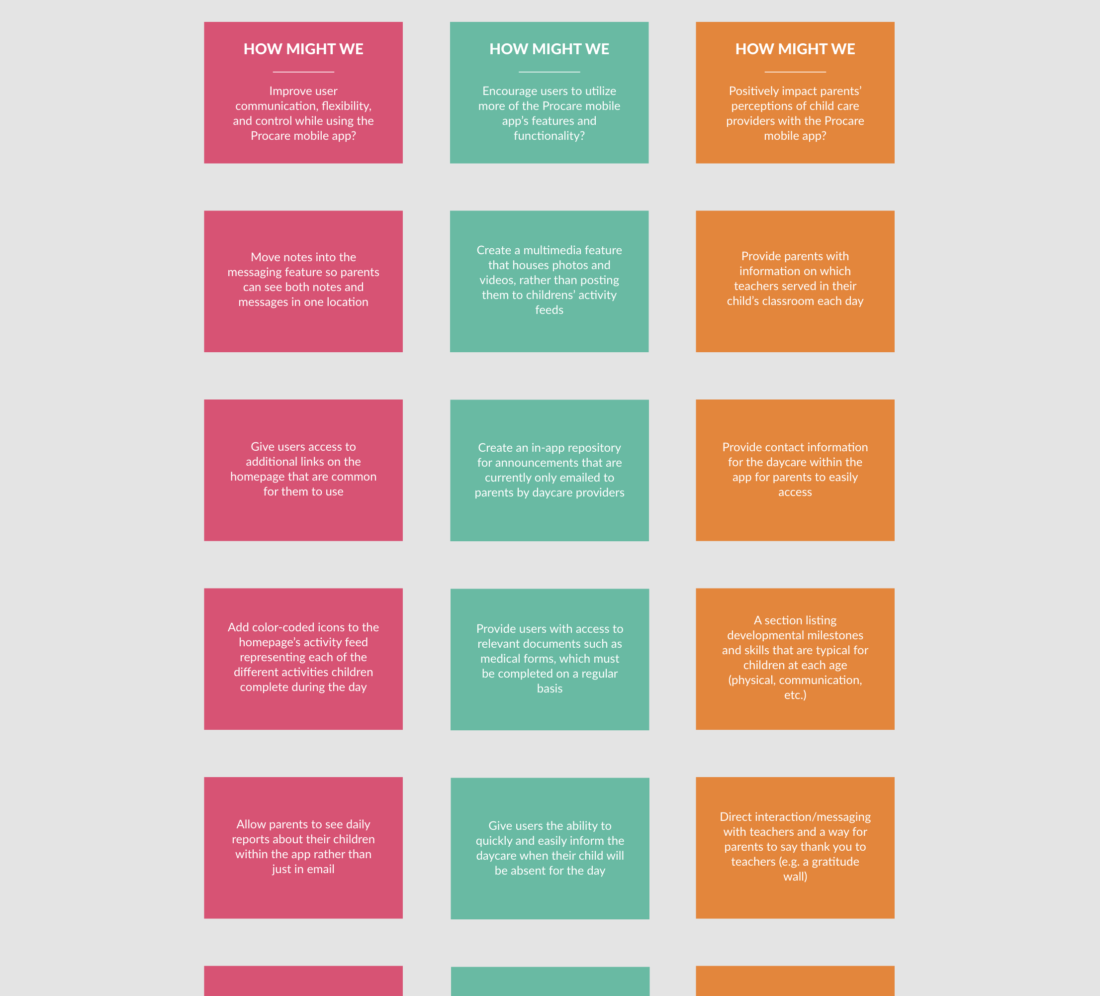 During the brainstorming phase, I navigated through and interacted with every feature, function, and screen in the Procare app, writing down a list of potential questions as they occurred to me. Using these and the assumptions generated earlier, I put together several “How Might We” questions and began ideating, which I’ve included in part below: